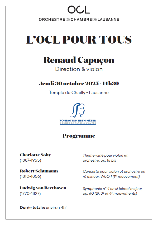 Cet après-midi musical s’adresse aux bénéficiaires de la Fondation Eben-Hézer et promet un moment de partage et d’émotion dans un cadre intime et chaleureux. L’OCL, reconnu pour l’excellence de son interprétation et sa proximité avec le public, offrira un programme varié qui saura ravir aussi bien les mélomanes passionnés que les curieux en quête de découverte.